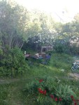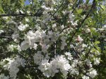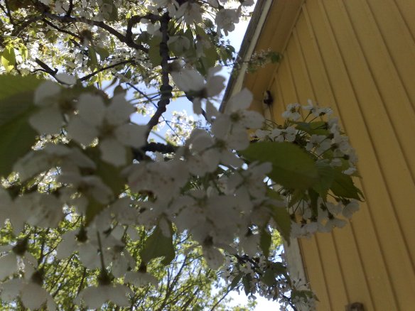 Äppelträden knoppas eller bär blommor. Knölarna hamnade i jorden idag. Det snöade körsbärsblom och plommonträden blommade. Vi lunchade i syrenbersån och senare byggde A ett kök där. Syrenerna bar stora knoppar och har nog blommat ut till midsommar. En katt sågs sola magen i gräset.