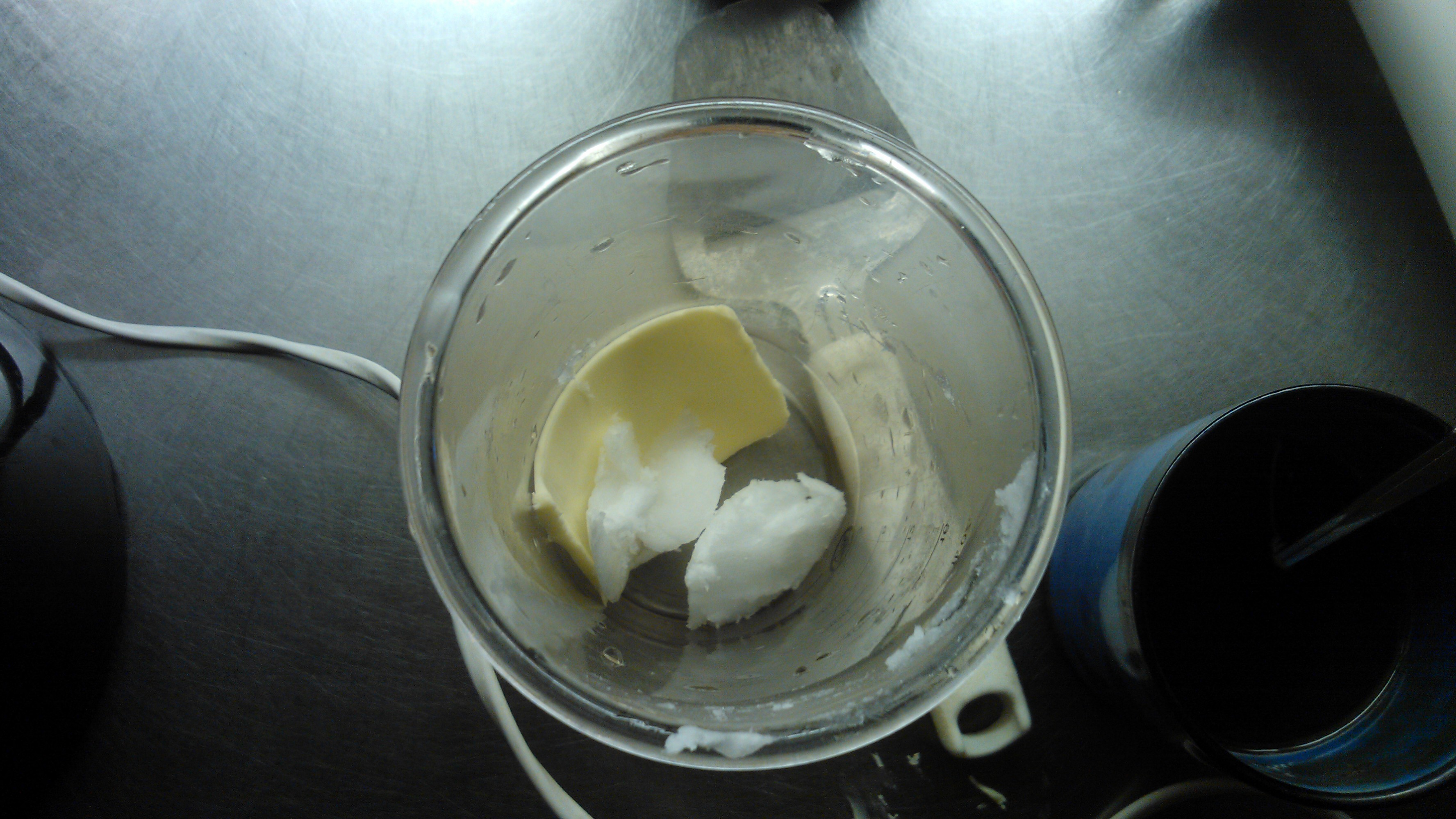 Tag ett par skedar kokosfett och ett par smörskivor och lägg i en burk