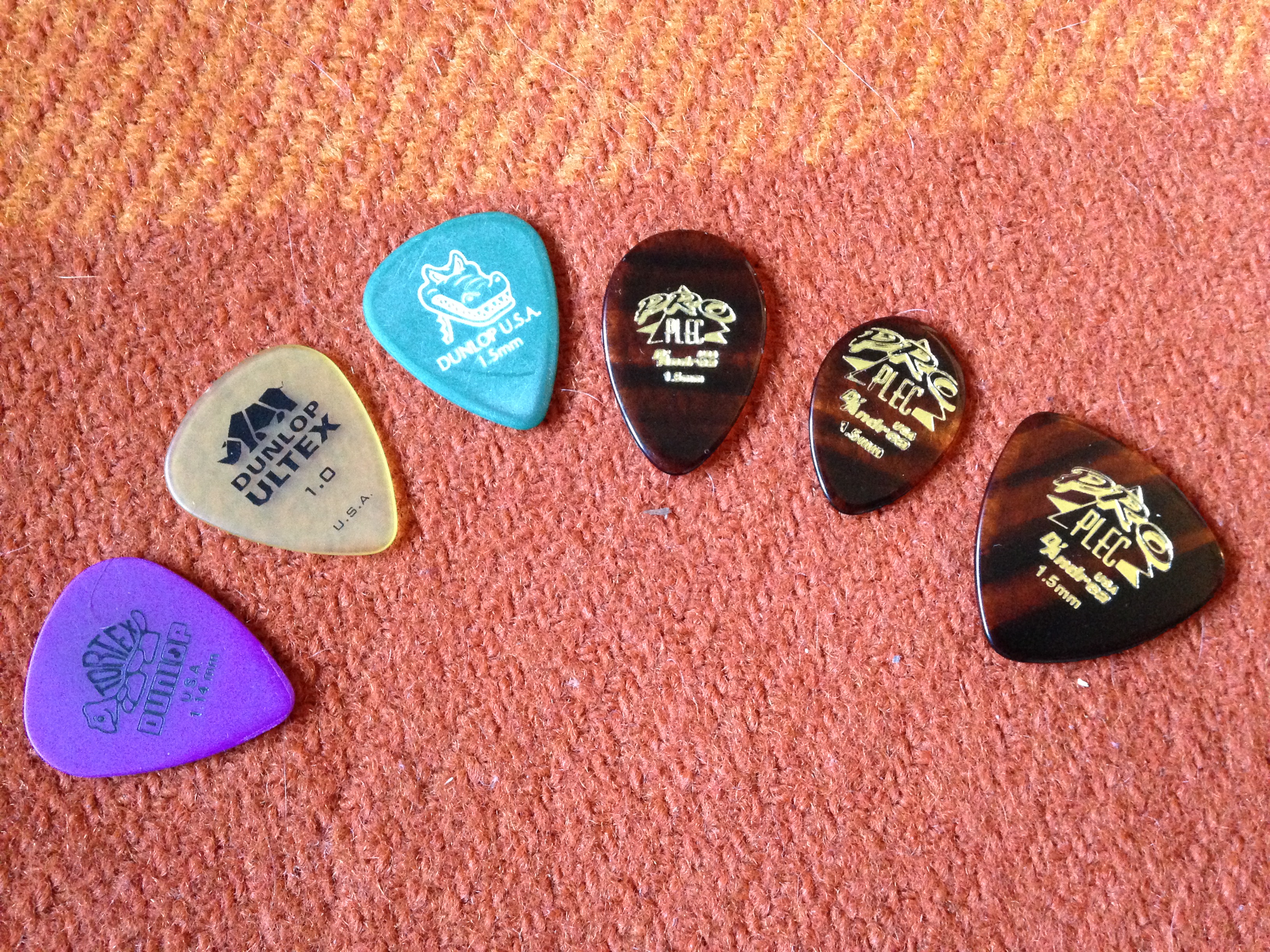 Dunlop Tortex 1.14mm, 1.0 mm och Dunlop Wedge, 1.0 mm. Därunder följer Dunlop Gator Grip 1.14 och 0.96. Sedan ensam i nästa rad ligger guldfärgade Dunlop Joe Bonamassa Jazz III. Sedan följer svarta Fire Stone 1.0 och ett guldigt av okänt märke, cirka en millimeter tjockt och fjorårets favorit.I den understa raden hittas nylonplektran från Dunlop, Earnie Ball och Fire Stone, 0.73 – 0.45 mm.