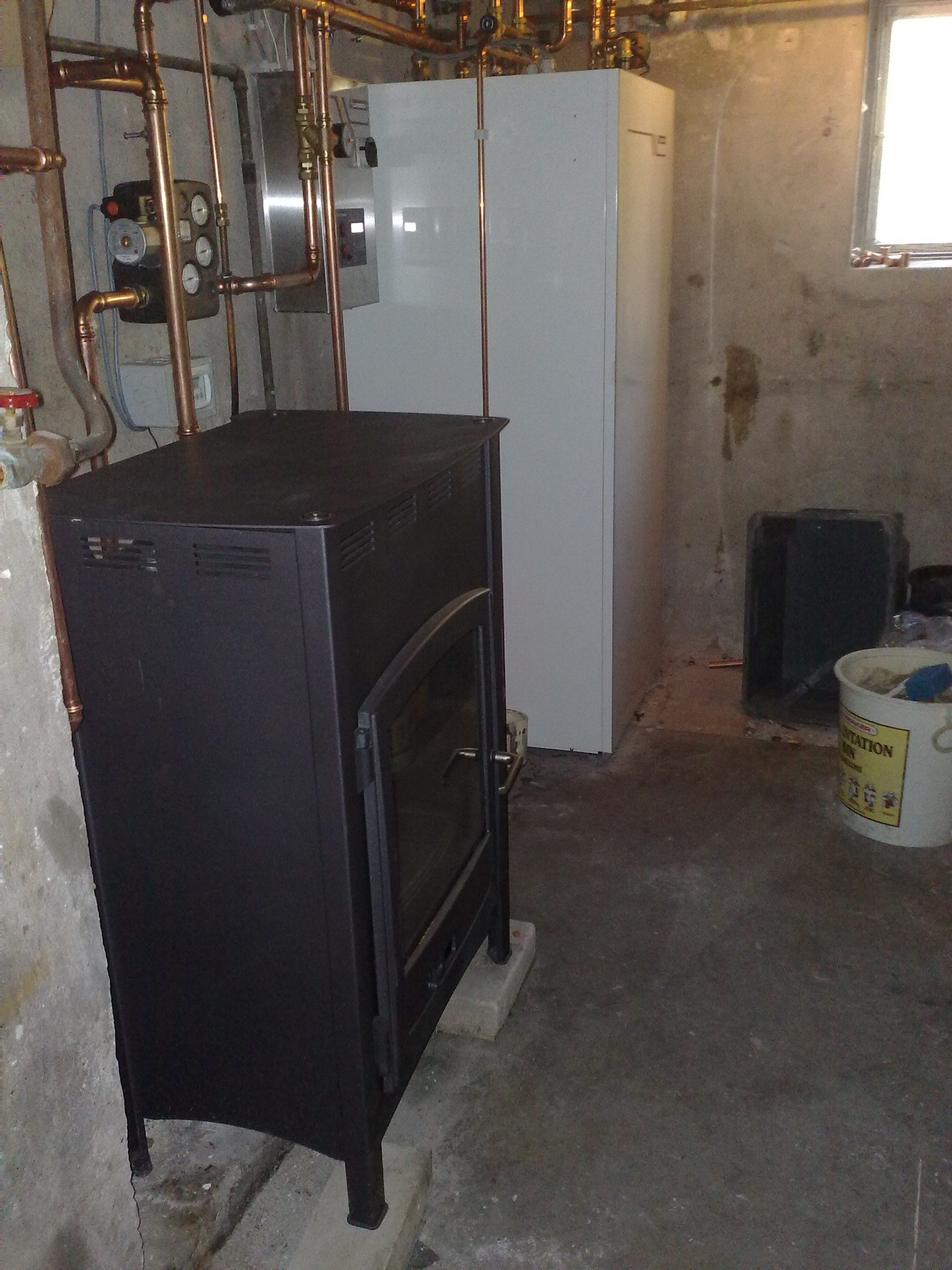 Tanken är en ExoTank VPS på 500 liter med två elpatroner, 3 kW och 6 kW och värmepumpen en ExoAir Polaris som ger en värmeeffekt på 9,9 kW vid en ineffekt på 3,37 kW. Och så Alice då som vi tänker elda kalla vinterdagar, en vattenmantlad vedkamin.